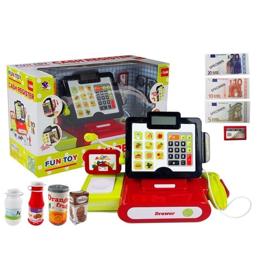 Kasos aparatas su liečiamu ekranu vaikams – interaktyvus edukacinis žaidimas su skeneriu, mikrofonu, svarstyklėmis, žaisliniais produktais, pinigais ir kortele. Leidžia mokytis pinigų vertės, matematikos ir parduotuvės žaidimų principų.