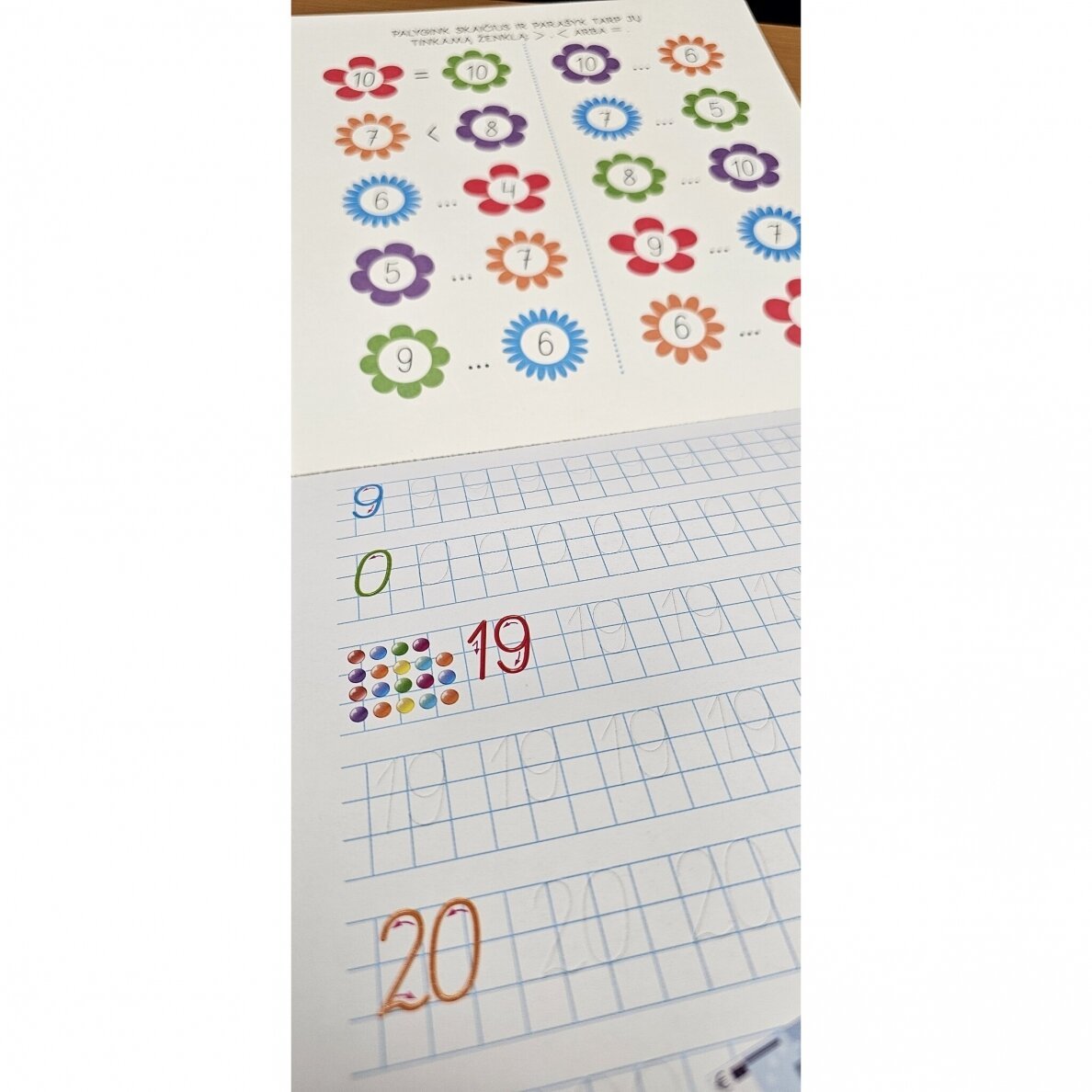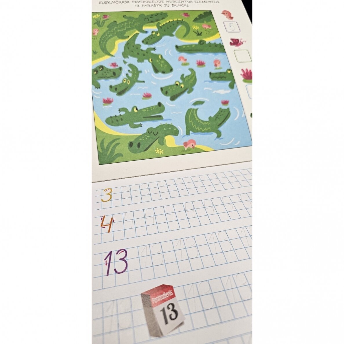 „Rašau skaičius ir skaičiuoju“ – knygelė su grioveliais, padedanti 6–7 metų vaikams mokytis rašyti skaičius iki 20 ir atlikti paprastus skaičiavimo veiksmus. Puiki priemonė rankos lavinimui ir matematinių įgūdžių stiprinimui.