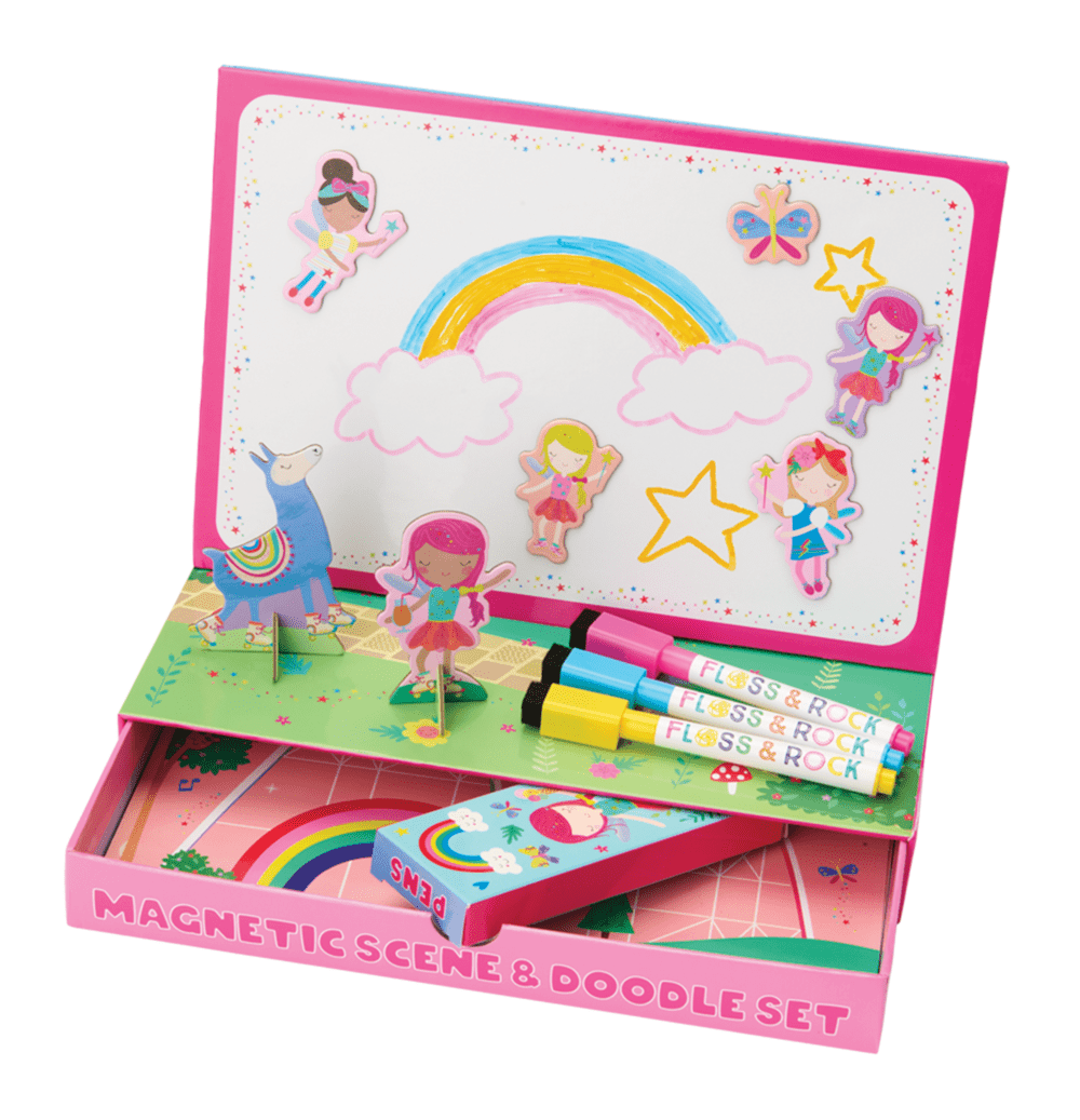 Magnetinis žaidimas ir piešimo rinkinys „Vaivorykštės fėja“ – kūrybinis rinkinys su magnetukais ir piešimo lenta vaikams nuo 3 metų, lavinantis vaizduotę ir kūrybiškumą.