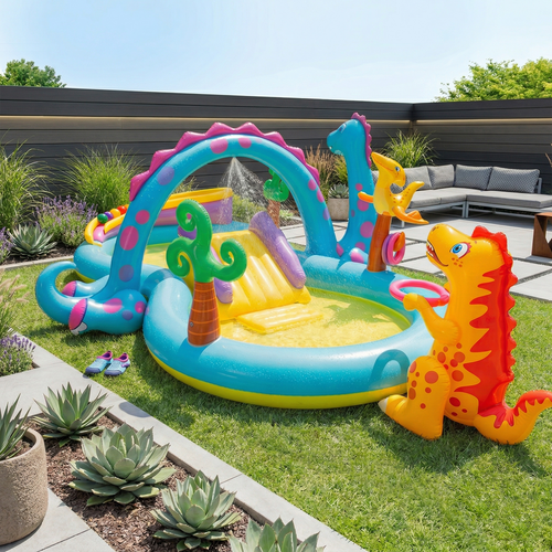 Šis rinkinys sukurtas taip, kad vaikas nenuobodžiautų – čia yra čiuožykla, vandens purškimo arka, kamuoliukai ir pripučiami žaislai. Puikus pasirinkimas aktyvioms vasaros pramogoms namuose.