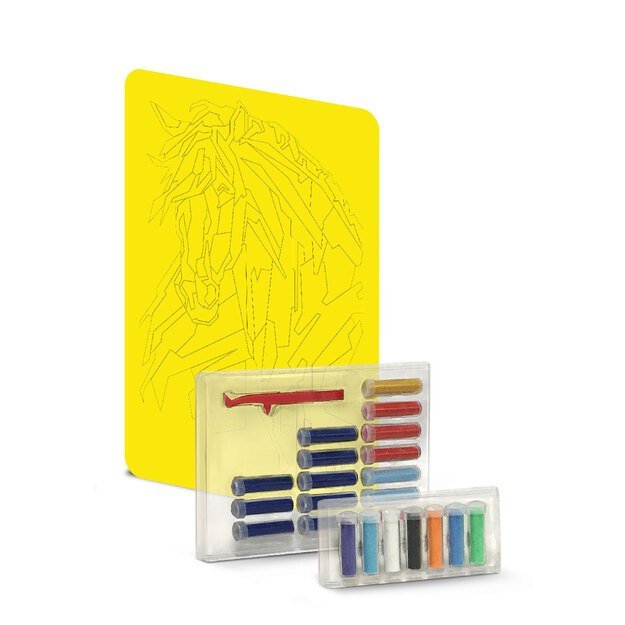 „Red Castle“ smėlio rinkinys „Žirgas“ – kūrybinis rinkinys su 22 spalvų smėliu, leidžiantis sukurti įspūdingą žirgo paveikslą ir mėgautis raminančia kūrybine veikla.