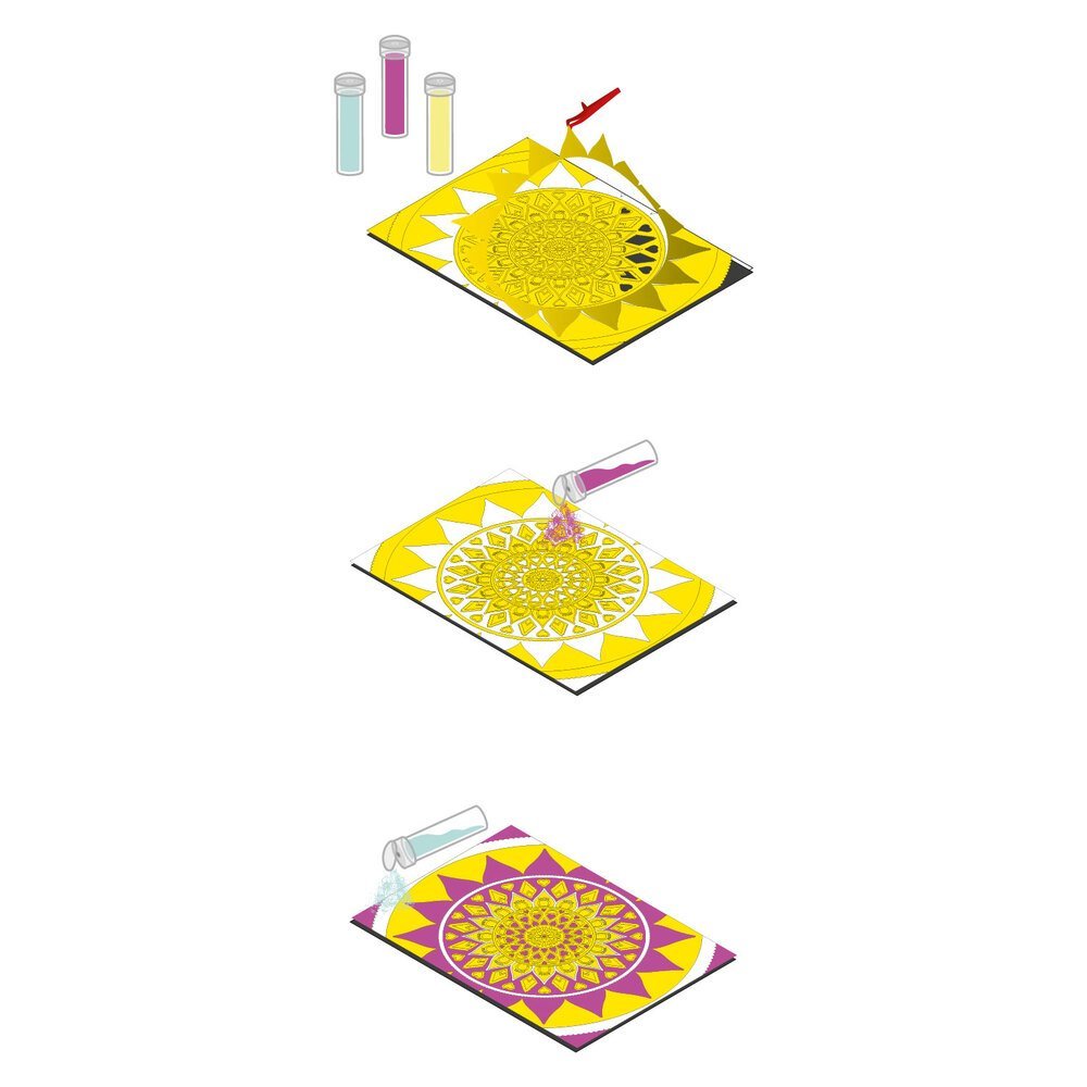 Mandala – harmonijos ir ramybės simbolis, todėl jos dekoravimas spalvotu smėliu tampa puikia kūrybine ir terapine veikla. Pamažu užpildydami piešinį smėliu galėsite sukurti ryškų ir unikalų meno kūrinį.
