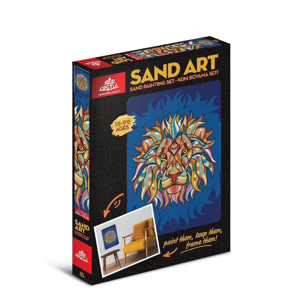 Red Castle smėlio rinkinys „Liūtas“ – kūrybinis rinkinys su 22 spalvų smėliu, leidžiantis sukurti įspūdingą liūto paveikslą ir mėgautis raminančia kūrybine veikla.