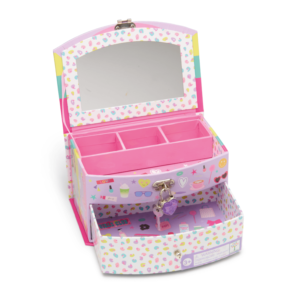 Užrakinama papuošalų dėžutė „Super draugės“ su veidrodėliu, stalčiuku ir širdelės formos spyna – patogus ir stilingas sprendimas papuošalams laikyti.