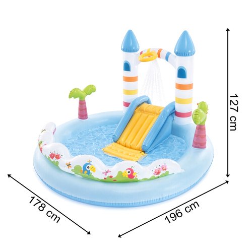 Pripučiama vandens žaidimų aikštelė „Vienaragio pilis“ – baseinas su čiuožykla ir fontanu vaikams nuo 2 metų