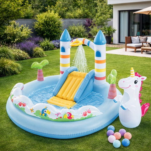 Paverskite savo kiemą tikra pasakų karalyste! Pripučiama vandens žaidimų aikštelė „Vienaragio pilis“ – tai spalvinga ir smagi pramoga, kuri leis vaikams pasinerti į fantazijų ir vandens nuotykių pasaulį.